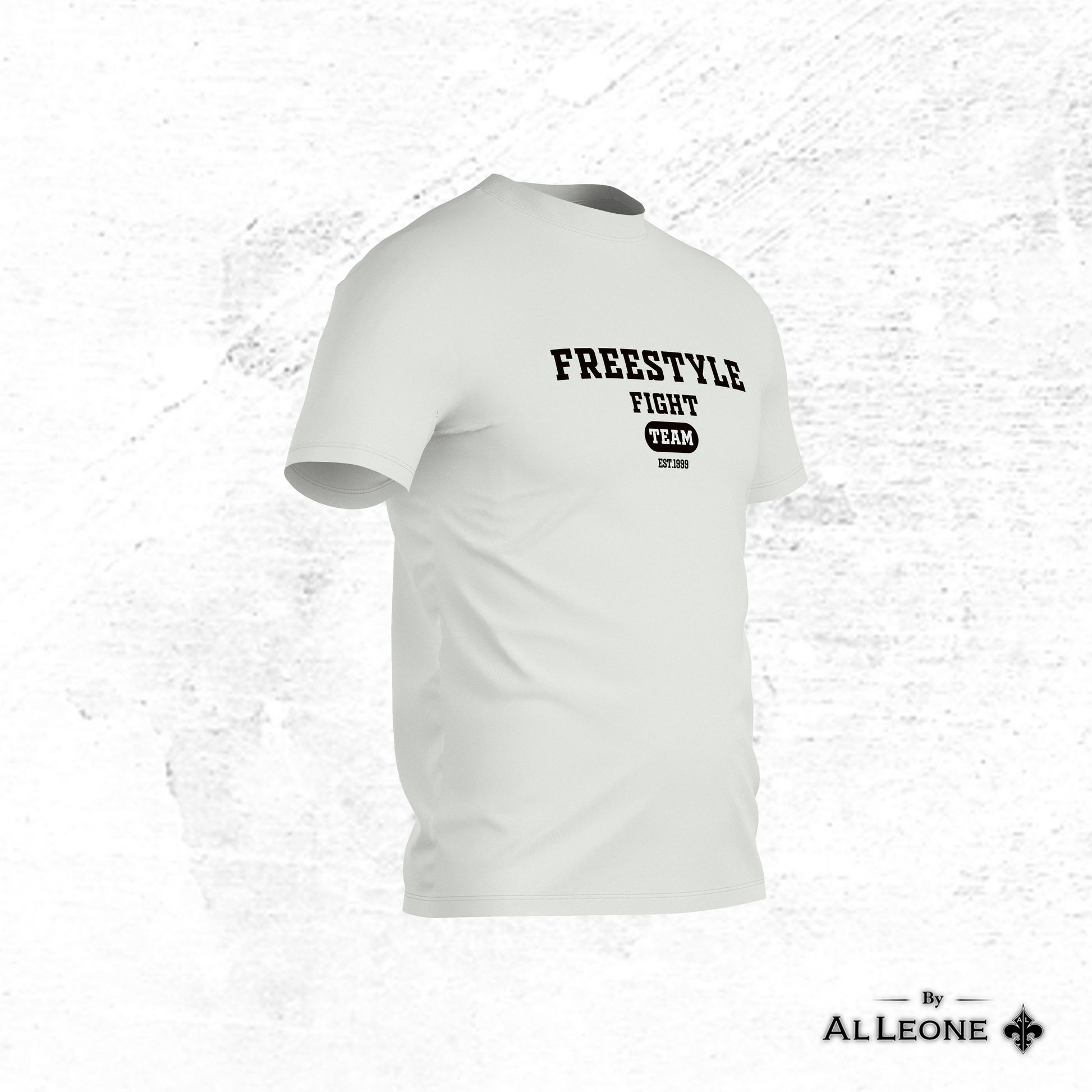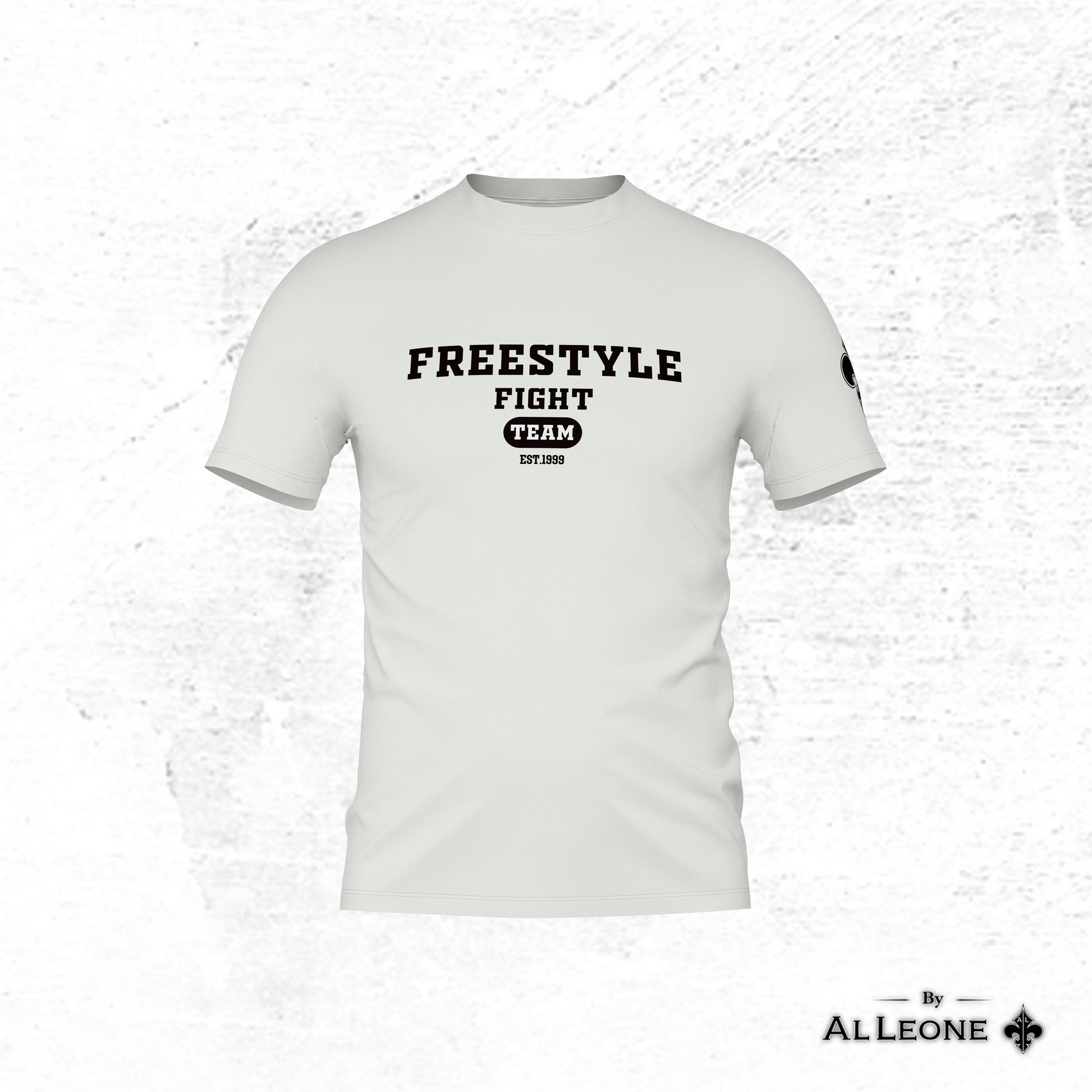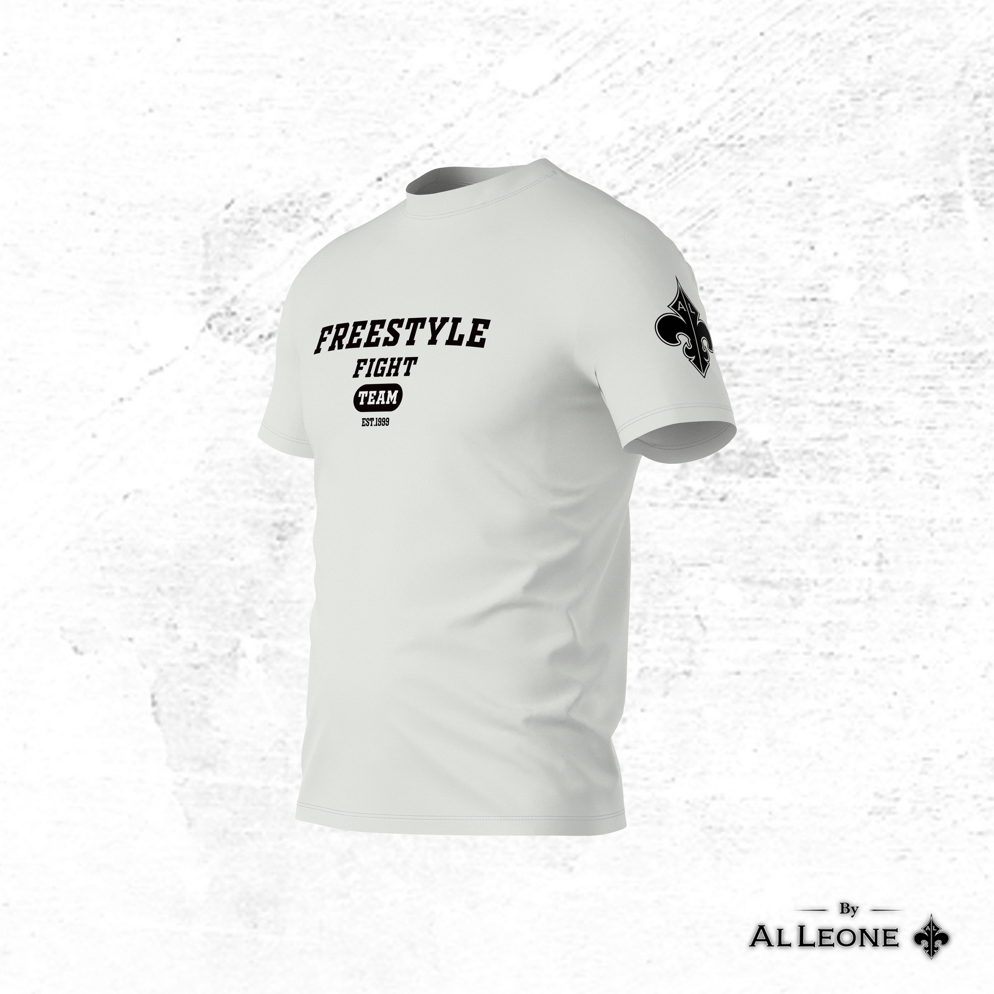 Freestyle MMA and AL LEONE have collaborated to create exclusive white and black t-shirts with their logos, featuring a regular cut for a comfortable fit. These shirts blend Freestyle MMA's dynamic spirit with AL LEONE's quality craftsmanship.