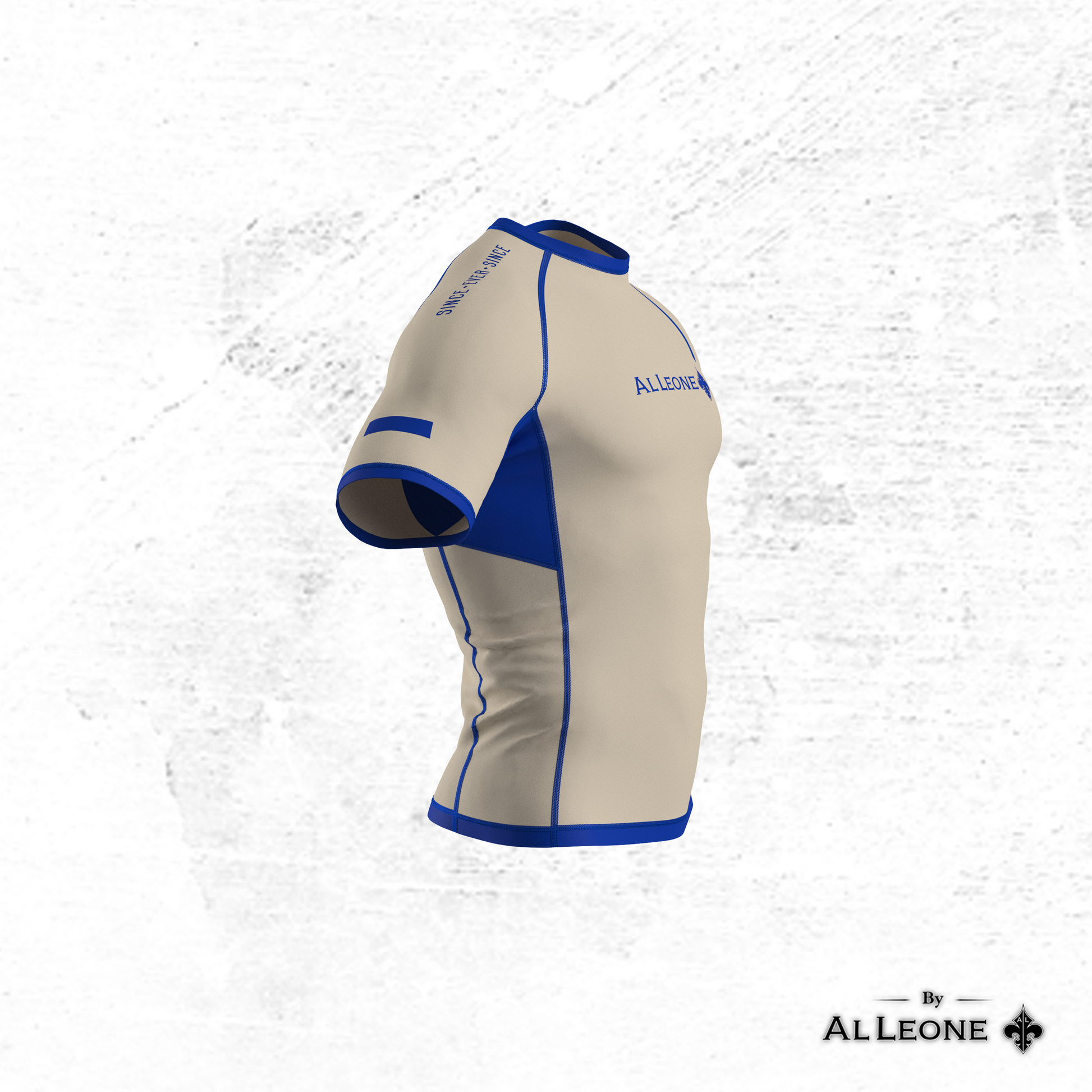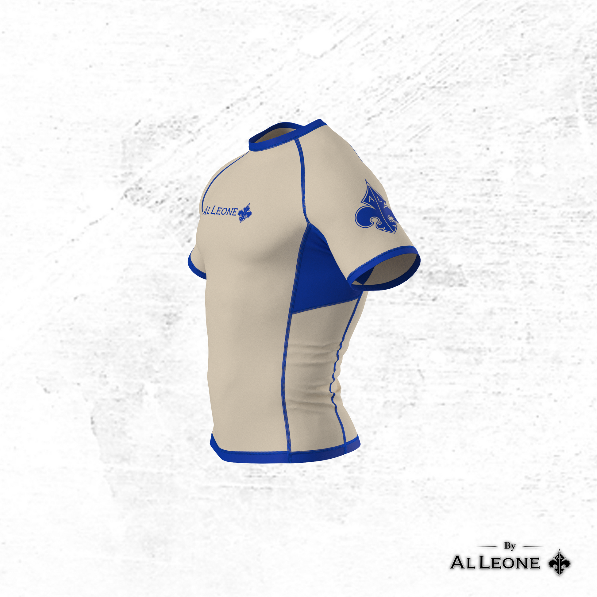 Classic white BB AL Leone short sleeve rash guard with a dark blue trim. Stay calm and cool through your training.
